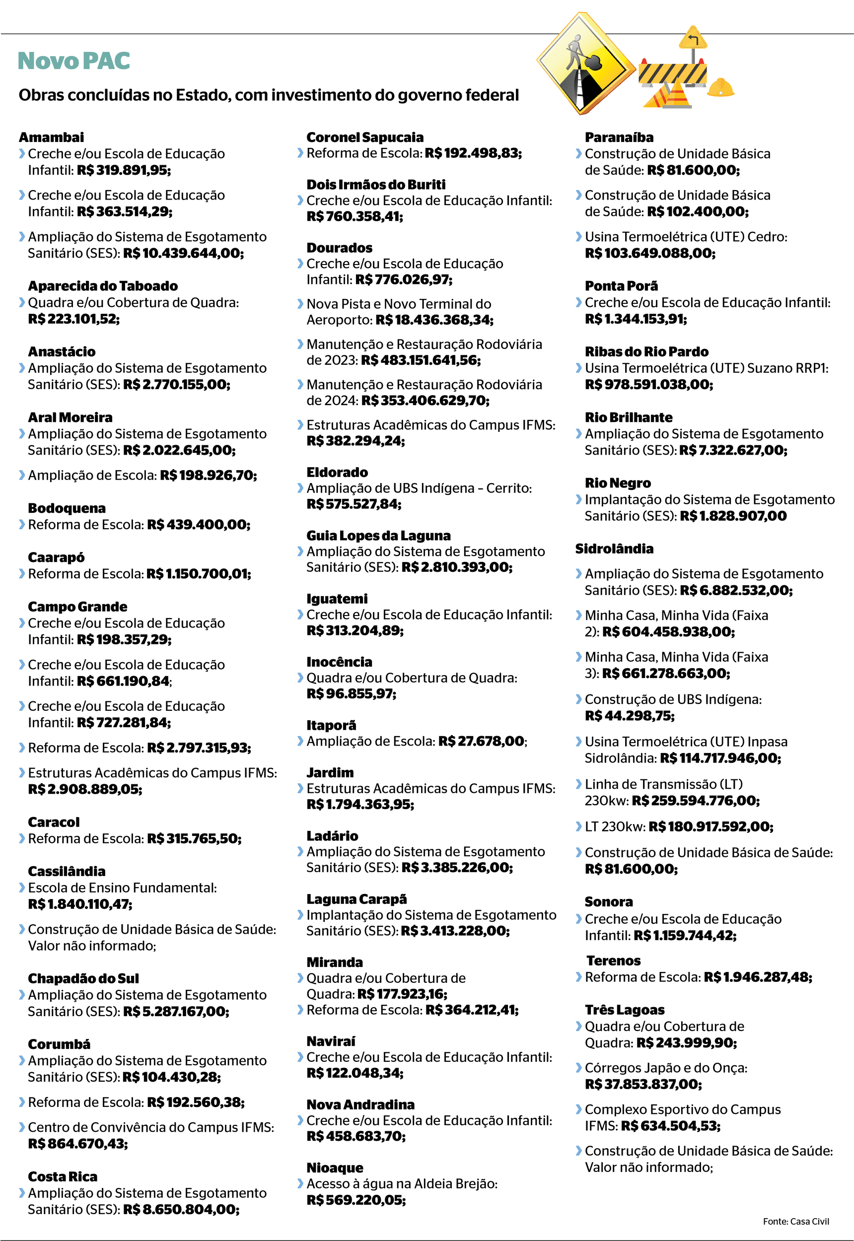 O Novo Programa de Aceleração do Crescimento (Novo PAC), anunciado pelo presidente Luiz Inácio Lula da Silva (PT) em agosto de 2023, gastou R$ 7,6 bilhões, menos de 40% do investimento total previsto até o fim de 2026 em empreendimentos em Mato Grosso do Sul.