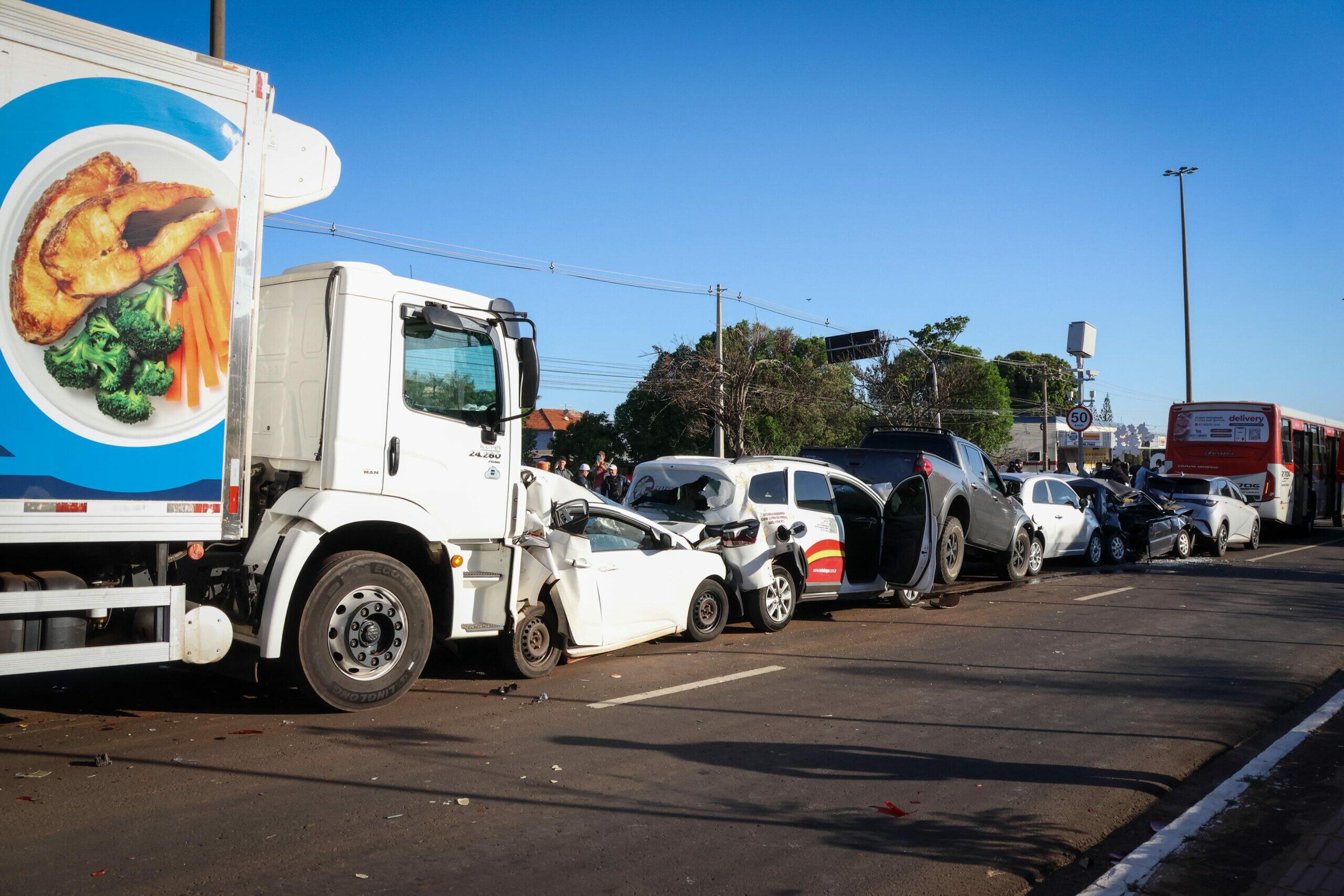 Um acidente terminou com o engavetamento de nove veículos na tarde desta terça-feira (23), na Avenida Coronel Antonino, em Campo Grande. Pelo menos duas pessoas ficaram gravemente feridas, mas não correm risco de morte.