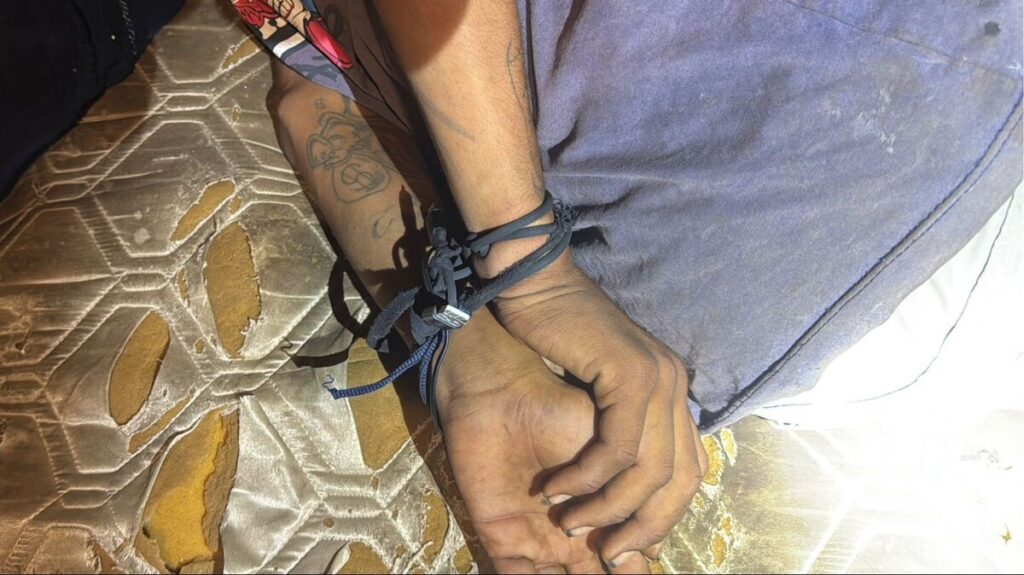 Ao entrar no imóvel, os militares localizaram um suspeito, de 23 anos, que estava no sofá da varanda. Durante a varredura, em um dos quartos, encontraram a vítima com os pés e mãos amarradas com fios de carregador de celular e cadarços, deitado na cama.